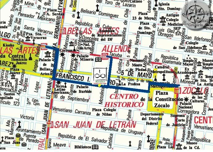 Bellas Artes: Sí vienes por Bellas Artes, camina hacía el Eje Central Lazaro Cardenas y en donde veas la Torre Latinoamericana es la calle de Francisco I. Madero, camina sobre esa calle en sentido en el que van los carros y al llegar a Bolivar, verás un letrero de la librería.
